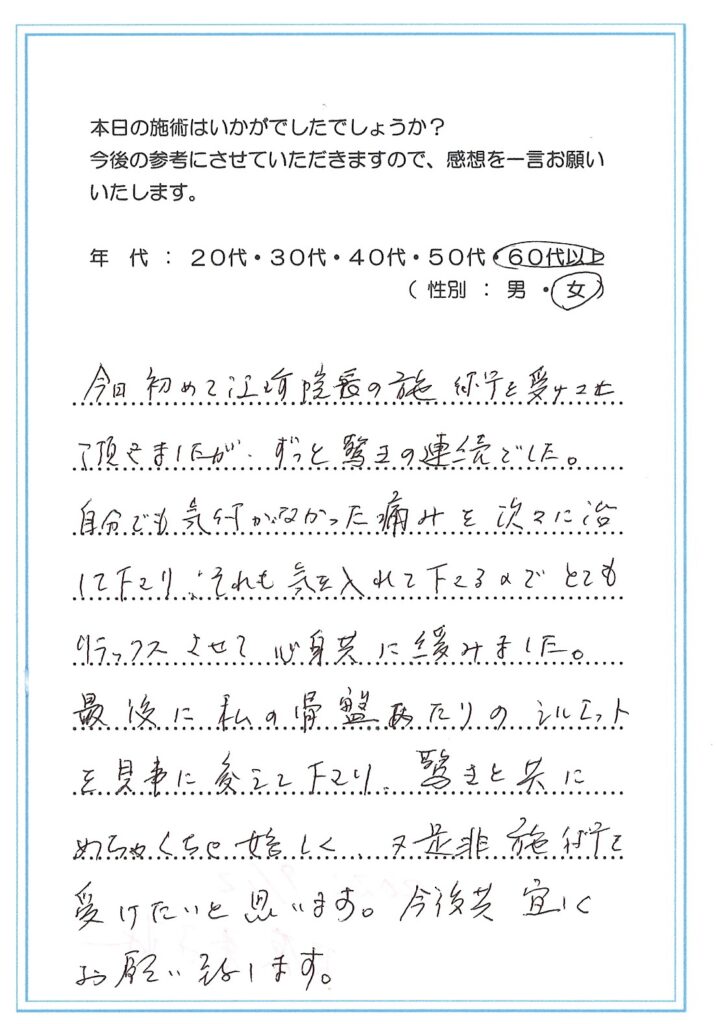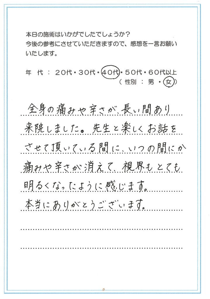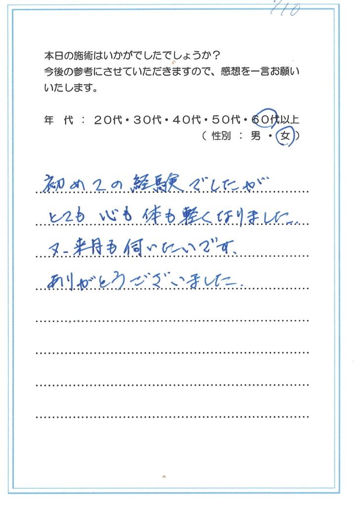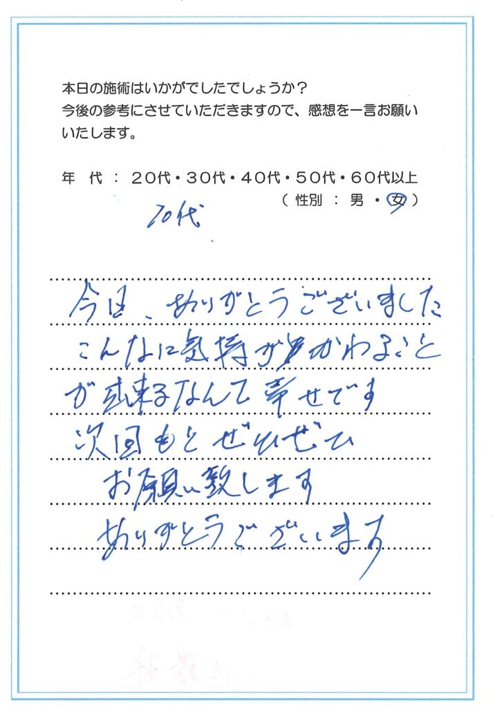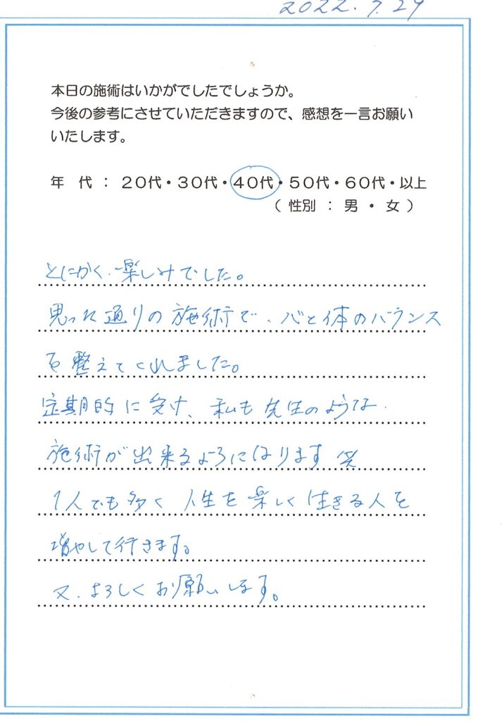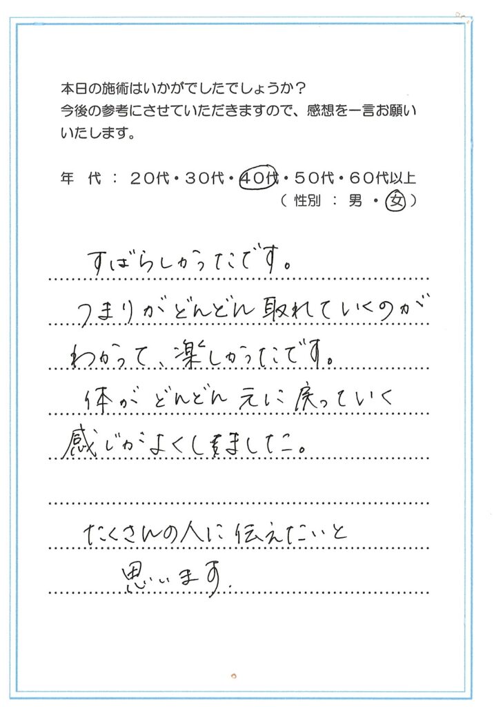 私の治療を受けていただいた方が誰かに口コミをしていただき、また来られた方も次の方に口コミを~また次の人も、また次の人も~